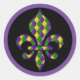 This small size round sticker is shown in a festive Mardi Gras celebration Fleur De Li print design.