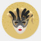 This large size round sticker is shown in a festive Mardi Gras celebration mask print design.