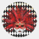 This small size round sticker is shown in a festive Mardi Gras celebration mask print design.