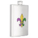 Design with seamless pattern with fleur-de-lys (lilly flowers) in the colours of New Orleans Mardi Gras; purple, golden and green design on white background