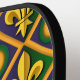 A pickleball paddle with a seamless pattern with fleur-de-lis (lily flowers) in the colors of New Orleans Mardi Gras; purple, golden, and green design
