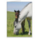 Photograph of a grey mare grazing with a bay colt standing next to her, nestled into her neck.