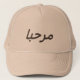 Bold text " Marhaba" in Arabic = Welcome , Hello - dark brown fonts are printed on a khaki hat . You can choose another colours /styles if you choose to customise .