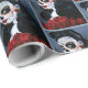 Portrait of a woman wearing sugar skull day of the dead make-up with red roses in backdrop of blue grey