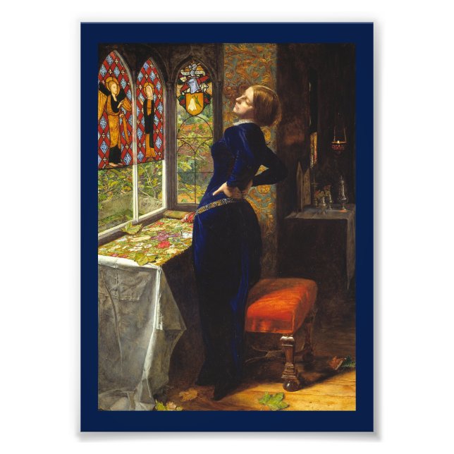 Mediaeval inspired maiden stands up and stretches in front of stained glass windows. Vintage fine art painting by English artist John Everett Millais 1858. Pre Raphaelite era.