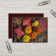 This Artist Trading Card just has the feel of a late autumn day in the garden, looking down on the ground at this colourful arrangement of orange and yellow marigolds and three red maple leaves, all on a bed of hay.