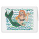 She floats under sea with the greatest of ease. Combing her hair with her delicate fingers, her sea shell earrings glittering when the moon light hits the water. There she goes, swimming under water, smiling, an angel under the sea with her long green and purple fish tail guiding her along. And that wild blonde and red hair flowing out. Every one will notice her and if a man catches her in his net he will want to hold her forever. Own the winsome Marina the Mermaid on products for men and women alike. The men will dream about her and the ladies will want to emulate her. Watch out for dual designs on coffee mugs, tea pots, the pillow and the tie.© Hand drawn by Sandy Daley