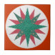 Photograph of mariner's compass quilt piece with red background. Red and green calico fabrics.