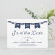 Ahoy! Make it official and invite your wedding guests to mark their calendars with these nautical chic save the date cards in a classic preppy color palette of navy blue and white. Maritime design features your wedding date displayed on a bunting of nautical signal flags, with "save the date" and your wedding details in a mix of block and script typography accented with a small ship's anchor. Cards reverse to wide navy and white horizontal stripes.