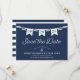 Ahoy! Make it official and invite your wedding guests to mark their calendars with these nautical chic save the date cards in a classic preppy color palette of navy blue and white. Maritime design features your wedding date displayed on a bunting of nautical signal flags, with "save the date" and your wedding details in a mix of block and script typography accented with a small ship's anchor. Cards reverse to wide navy and white horizontal stripes.