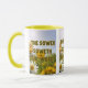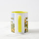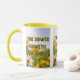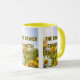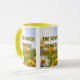 This two-tone mug showcases a brought font with green letters yellow outline featuring the "Mark 4:14" KJV bible scripture verse over a background picture displaying a field of different coloured flowers with green stems plus an upclose view under a clear blue sky in this floral theme. This verse is referencing the Book Of Mark 4th chapter showing the 14th verse in this bible scripture quote theme from the King James bible. The rim & handle are glazed in matching colours available in 11-ounce or 15-ounce sizes microwave and dishwasher safe ceramic construction.