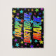 This vibrant, exciting, birthday-themed jigsaw puzzle design has the message "HAPPY BIRTHDAY, MARK" with the characters having a colourful rainbow spectrum inspired gradient pattern, along with a fun star field background pattern. A vibrant puzzle like this might be a fun way to send birthday wishes to somebody named Mark. [~Z0000468]