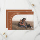 Modern and stylish save the date card featuring a text that says "mark your calendars" along the curved frame photo. One photo in the front and one on the back. The background is terracotta.