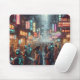 A crowded cyberpunk street market with robotic vendors, multi-language neon signs, and people wearing AR visors.
