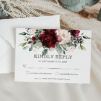Rich Burgundy Blush Pink Roses Floral Wedding RSVP Card