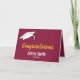 This maroon and gold graduation card has a white graduate's cap in the upper left corner. Display text says 'Congratulations' in a gold script. On the front, you can customise the card with the graduate's name in white text. You can even add the year the student is graduating under the name. Inside the card, there's a message and a place to add the graduate's name and the sender's name. The maroon is HEX #8C1D40. Gold is HEX #FFC627.