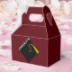 Graduation party favours gifts for the grad featuring congrats, black graduation cap and gold tassel on a maroon background.