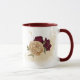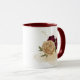 Beautiful coffee mug featuring maroon and beige gold flowers with green leaves .