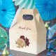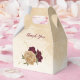 Beautiful fall wedding favour box featuring maroon and beige gold flowers with green leaves .