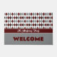 Oversized elegant argyle pattern in school colours of dark green and bright yellow set the backdrop for this design. Welcome in large letters and your family name included. Great idea for a house-warming! Design comes in maroon and grey, burnt orange and grey, red and black, green and black, orange and navy, green and yellow, and purple and grey. Matching products available.