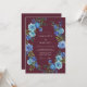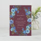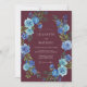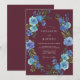 This design features a deep maroon background accented by a vibrant arrangement of blue roses and verdant foliage. The moody colour palette creates a sophisticated atmosphere perfect for a late-season nuptial event. Painterly watercolor details bring a sense of artistry and elegance to the floral display.