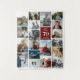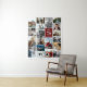 Tapestry for a birthday celebration featuring a photo collage of 19 photos, name, and age. Perfect for big celebrations where you can add lots of photos from the long life of the birthday celebrator. Birthday party decor in the form of a tapestry personalised with photos, name, and age in white against a dark red background.