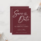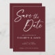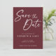 Modern maroon background with white handwriting style wedding Save the Date invitation card. This design features large calligraphy style font that you can change its colour from white to any other colour you like. You can also customise all details and colours on this Save the Date design.