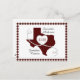 A casual and fun way to share your joy well in advance of your big day. Send these Texas save the date cards out to all your family and friends. Design features a large state shape with a heart made from a white ribbon with black dashes. Space inside the heart for your date and at the bottom for your location. Bordered with a coordinating gingham pattern. Perfect mix of classy and rustic in case you haven't decided what style you're going with! Available Texas school colours of red, green, dark green purple, maroon, and burnt orange as well as blue and black. Matching products available.