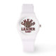 Great looking sporty cheerleader's watch with maroon graphic text reading Cheer Leader surrounding a brown football, in the middle. Personalise the maroon text on the bottom with your favourite cheerleader's name. Makes a great gift idea.