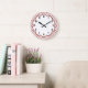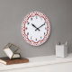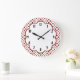 This is a pretty kitchen clock with a maroon red and white floral stencil background, and a scalloped edge white field for the easy to read numbers. A throwback to the kitchens of the 50's and 60's!