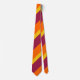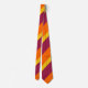 This bold tie contains maroon, orange, and yellow-gold diagonal stripes.