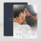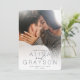 A simple and modern wedding save the date design featuring a full bleed vertical photo, with your names at the bottom in modern lettering, joined by a flourished script "and." Personalise with your wedding date and location, and add additional details to the back, like your wedding website. Due to the placement of the text and design elements, this style is recommended for vertical photos with ample space near the bottom.
