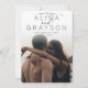 A simple and modern wedding save the date design featuring a full bleed vertical photo, with your names at the top in modern lettering, joined by a flourished script "and." Personalise with your wedding date and location, and add additional details to the back, like your wedding website. Due to the placement of the text and design elements, this style is recommended for vertical photos with ample white or light space at the top,
