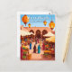 A Marrakech postcard design showing a colourful Moroccan souk with market stalls, fruit vendors, and glowing lanterns. A perfect travel souvenir postcard from Marrakech, Morocco.