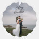 Celebrate your first Christmas as a married couple with this beautiful 'Married and Merry' photo ornament Christmas Card that come with envelope to send to you friends and family. Doubles as a Christmas Ornament that they can put on their tree for years to come to remember your special day! Featuring elegant script and delicate floral accents, this ornament is the perfect way to showcase your wedding day memories. Add your favourite 2 photos and personalise it with your names and wedding date to create a truly unique keepsake. This 'Married and Merry' ornament will be a cherished addition to your holiday decorations for years to come, reminding you of your special day and the joy of the season. Share your happiness and holiday wishes with this unique and personal Christmas card, perfect for newlyweds first Christmas Card as a couple.