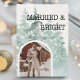 Celebrate your first holiday season as newlyweds with this beautiful, personalised "Married & Bright" holiday card! Featuring a watercolor pine tree background and an arch-shaped photo frame for your wedding picture, this card is the perfect blend of elegance and charm. The front showcases a vintage typewriter-style font, adding a timeless touch. On the back, share a heartfelt message to family and friends, making it not just a holiday card, but also a sweet way to thank your wedding guests. Perfect for spreading joy and gratitude this holiday season!