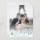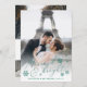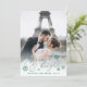 Elegant holiday photo cards for newlyweds feature a favourite vertical or portrait orientated wedding photo with "married & bright" overlaid in festive green calligraphy script adorned with snowflakes. Personalise with your names or custom greeting beneath. Perfect as a combination Christmas card and thank you card at your first married Christmas, you can add four additional photos to the back, along with a custom pre-printed message of thanks to your guests.