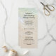 Tall, double-sided marriage ceremony program with beach water background. Sea green water and wet beach sand is the background on both sides. Black, printed font is used for all text except the title and message, which is script. Meant for a casual seaside wedding celebration, the text is easy to change and use spaces where needed to fill in. Shown on a tall, 4x9 inch card size, but the image works for all sizes. Choose another size and spread out the text if yours is a longer ceremony.