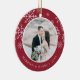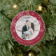 Festive photo Christmas ornament for newlyweds features a favourite wedding photo on each side, framed by white snowflakes on vibrant cranberry red. Personalise with a custom caption on each side; shown with "Married & Merry" on front and your names on the back.
