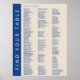 Simple to personalise, this Marseille Bleu 210 guest wedding seating chart poster can accommodate your wedding reception of up to 210 guests and you can choose your own format, from alphabetical to by table number seating. This minimalist design wedding table plan poster lends itself well to modern wedding themes as well as casual wedding themes or other events, with the navy blue border on the left and 3 columns of deep blue text on a soft ecru background. Each of the 3 columns have 70 lines each so if you choose to format your table plan chart alphabetically with no line breaks between names, you can fit 210 wedding guests. If you prefer spaces between letter groups, with or without headers, this will of course decrease the guest count. With this choose your own format wedding seating chart design, you can also organise the chart by table numbers for tables that seat 6, 8 or 12 guests, as well as 10 and can even mix table sizes if that is what your venue has available. The classic two toned colour palette of navy blue and ecru is a smart choice for all seasons, from fall and winter to spring and summer weddings. Customise this Marseille Bleu custom wedding seating chart poster for your 210 person wedding reception or other special event and if you have a larger wedding to organise, just customise and order 2 or 3 seating charts.