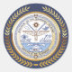The national seal or coat of arms of the Marshall Islands, is set on a white background. The emblem is infused into a faux gold circle shape, and that, in turn, is nestled in the middle of a faux gold laurel wreath.