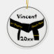 Personalise and date the unique Martial Arts First Degree Black Belt Round Ornament with the name of your martial artist and current year to commemorate a 1st Dan blackbelt promotion test or exam. This customised sports Christmas ornament features a digitally enhanced photograph of a martial arts black belt with one gold bar or stripe on the front with the words Black Belt Club on the back.