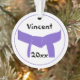 The unique Martial Arts Purple Belt Round Acrylic Ornament can be personalised with the name of your martial artist athlete and current year to commemorate and congratulate a purple belt rank promotion test or exam in karate, taekwondo, kung fu, judo or ju jitsu. This one of a kind personalised martial arts sports ornament features a digitally enhanced photograph of a martial arts purplebelt tied in a knot with a white background.