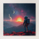 An astronaut stands on a rocky, red alien landscape under a vibrant sky filled with planets and stars. The scene is surreal with a large glowing planet dominating the horizon.