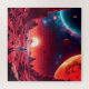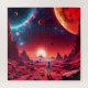 An astronaut stands on a rocky, red alien landscape under a vibrant sky filled with planets and stars. The scene is surreal with a large glowing planet dominating the horizon.
