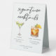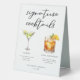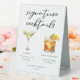 This chic signature cocktails table tent sign features simple black typography above 2 drinks and their ingredients for your wedding bar. A cute Martini and Dark & Stormy drawing add a cool flair to your bar menu. Complete with the couple's names and date for their reception.