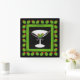 Decorate your bar or kitchen with this wall clock created with original art of a classic retro martini drink on black background with a green border surrounded by green olives with red pits. The drink is white outlined with grey lines and has two green olives. This original hand painted art is by Phyllis Dobbs and coordinates with other martini products and other retro drink art selections. Great gift idea for someone who loves dirty martini's and retro design. Fully customisable.