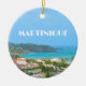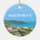 Martinique West Indies island photo showing the harbour with buildings and mountains. The name Martinique is in a vintage deco font.