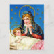 Vintage religious illustration showing Mary praying next to Baby Jesus as he sleeps.  Each has a halo around their head, and the setting is a starry night.  This is perfect for a Christmas postcard.