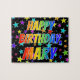 This lively and fun birthday-themed jigsaw puzzle design has the message "HAPPY BIRTHDAY, MARY" with the characters having a colourful rainbow spectrum inspired gradient pattern, along with an exciting star shapes background pattern. An exciting puzzle like this might be a fun way to send a birthday greeting message to somebody named Mary. [~Z0000468]
